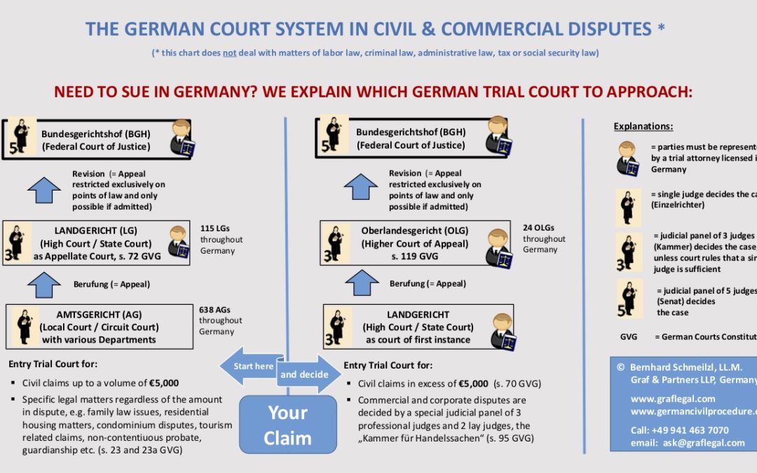 In case you need to litigate in Germany, one of the first tasks is to know your way around German Civil Courts (ordentliche Gerichte). The below chart shows you at one glance which is the correct civil court for your claim against a German defendant, how many judges will hear your case and what your options for appeal are should you lose the lawsuit.